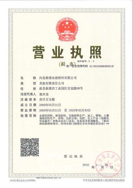 河北萌帮水溶肥料有限公司源于1995年所从事的农业植保技术服务,2009年成立,公司坐落于河北省赵县新寨店工业园区,占地41000平方米,集研发、生产、销售、服务于一体是全球专业的水溶肥料制造商和服务商。目前已经发展为一家拥有300多名员工、建有年产10万吨水溶性肥料生产线,并和其他厂家合资、合建、合作生产磷酸二氢钾3万吨、硝酸铵钙6万吨、工业磷酸一铵6万吨。   萌帮先后通过了ISO9001:2008国际质量管理体系认证;OHSAS18001:2007职业健康安全管理体系认证;ISO14001:2004环境管理体系认证;“萌帮”荣获了“河北省著名商标”称号。2013年,萌帮与国家科技部就“中量元素水溶肥料中试及产业化”项目进行了研发立项;萌帮的“卡丁”牌大量元素水溶肥料荣获河北省中小企业局“名牌产品”。2014年获得“高新技术企业”称号。 ...... [ 查看详情 ]