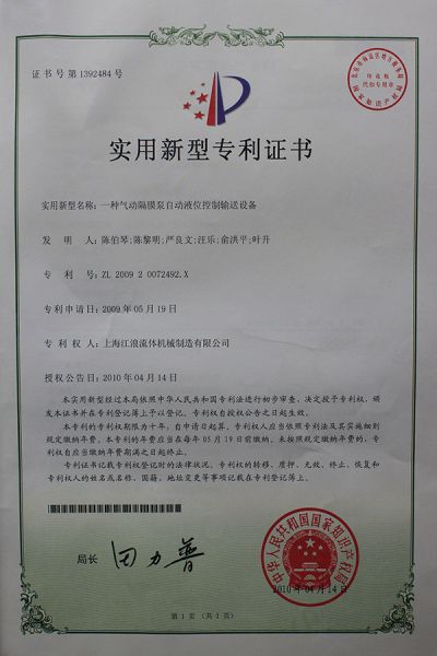 气动隔膜泵自动液位控制设备实用新型专利证书